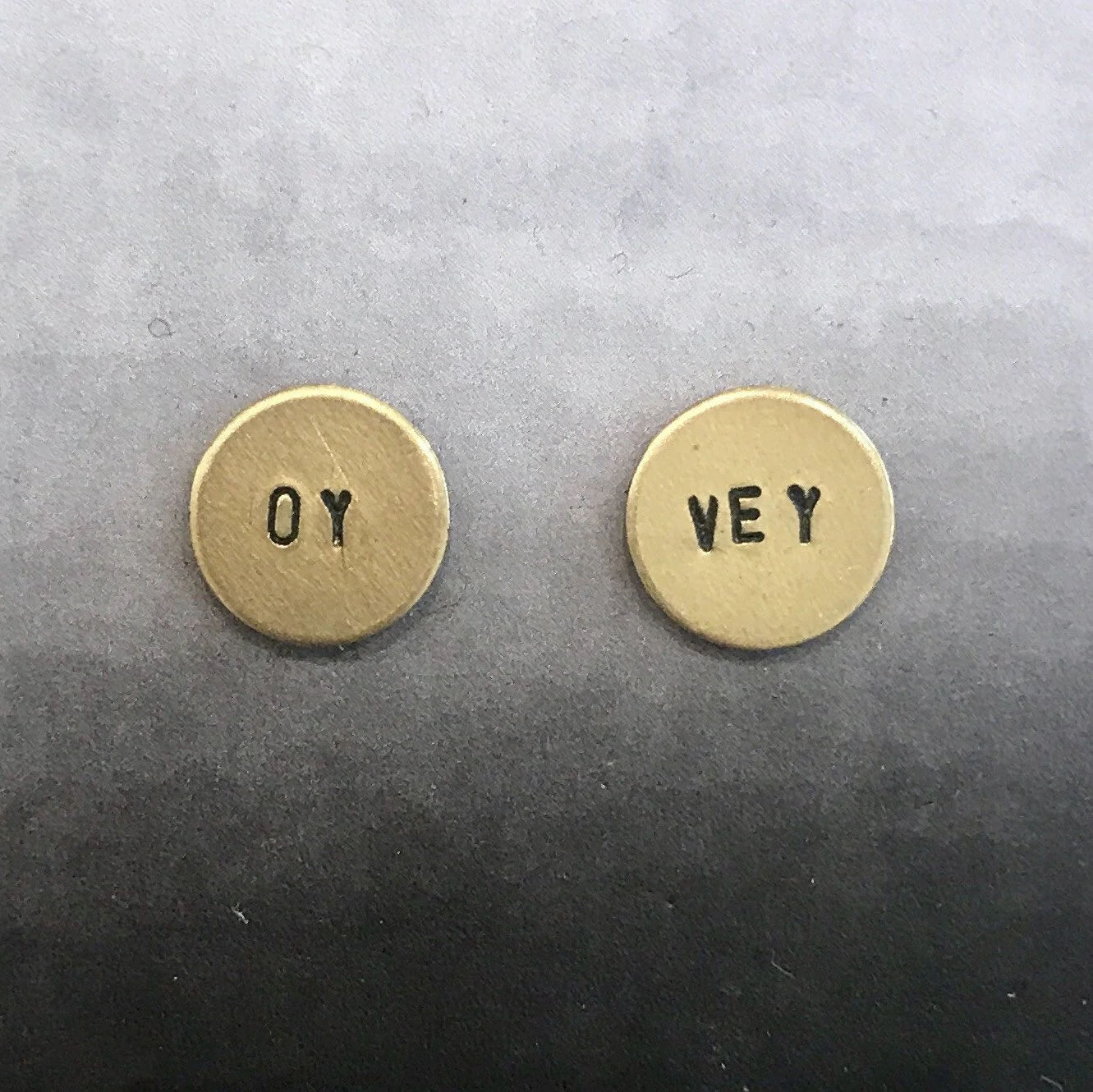 Dainty, hand Stamped, circle shaped, brass earrings that read “OY VEY”. Let’s face it, there are so many people that make you want to shout this from the roof tops!! Now you can wear your favorite yiddish sentiment and smile.
