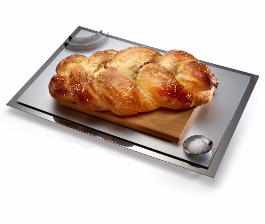 The high quality, shiny, stainless steel pieces are hand curved into waves. Both the waves and the steel salt dish are attached to the base by hidden neodymium magnets. The wooden board is also detachable if you prefer to rip and not cut your challah.