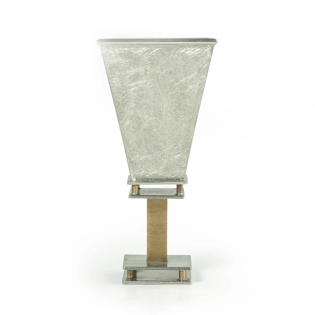 This beautiful Kiddush Cup is made from pewter and brass and fabricated together. The texture is roll printed into the pewter using a rolling mill.